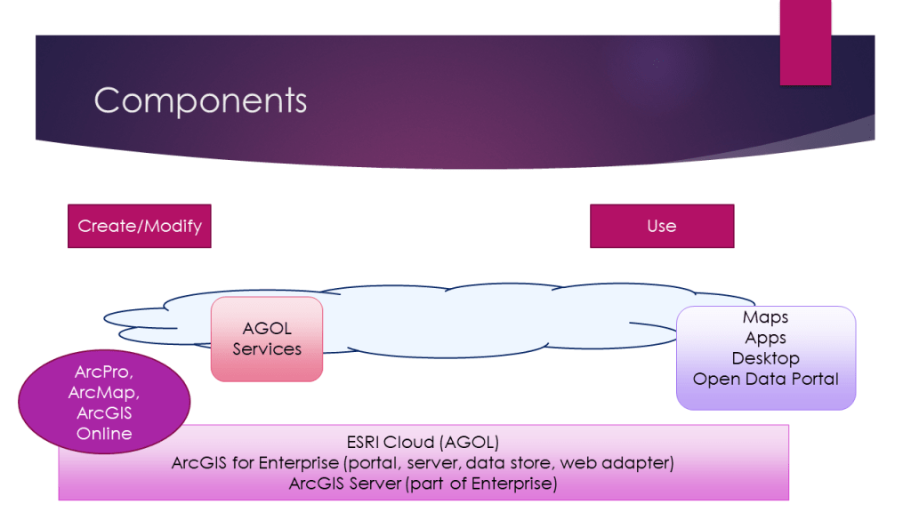 Any who….ESRI got its product developers together and launched AGOL a few years ago…..and not too much later, GIS for Portal (now rebranded as ArcGIS Enterprise and does include other components) for on-premise (on-prem) Web GIS.