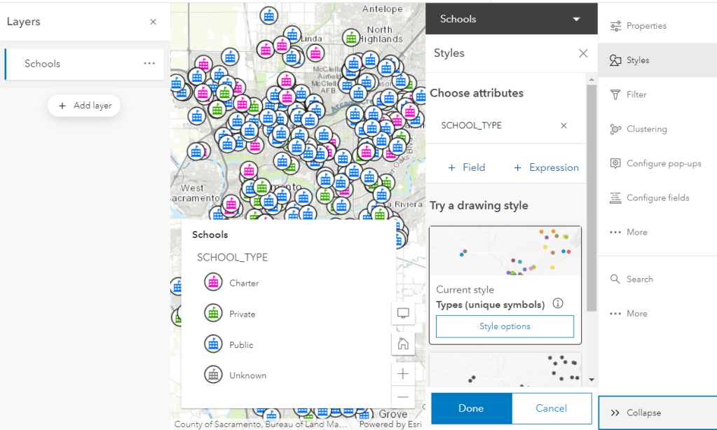 Try adding the “City of Sacramento Schools” (search for these key words in ArcGIS Online) and explore different options for styling and working with layers.