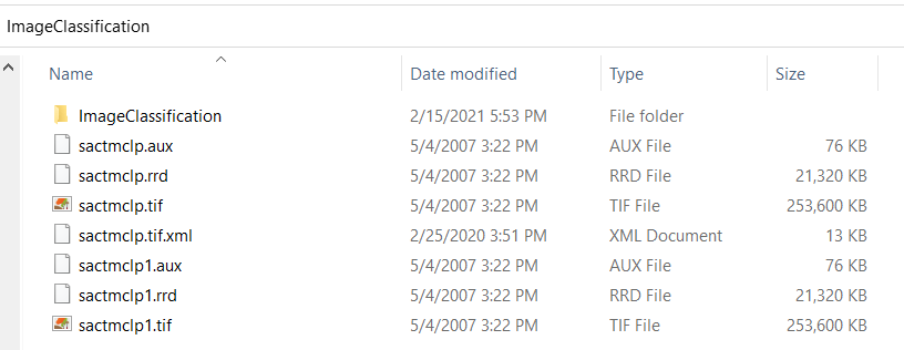 The screenshot below shows an example of a TIF file. The RRD (or OVR) and AUX files are additional files that often get created when loading a TIF file into a GIS platform for the first time. The RRD (or OVR) file is referred to a “pyramid layer” (created by ERDAS Imagine, the OVR file is created by ArcGIS) and allows for additional scales of the image to be loaded when the map scale changes when one zooms in/out of a map viewer. The AUX file is an “auxiliary” file that can contain other information related to the spatial reference, image statistics, and color ramps.