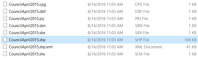 This screen shot shows the shapefile in Windows Explorer. Note all of the files with the same root name, esp the .SHP and the .DBF files.