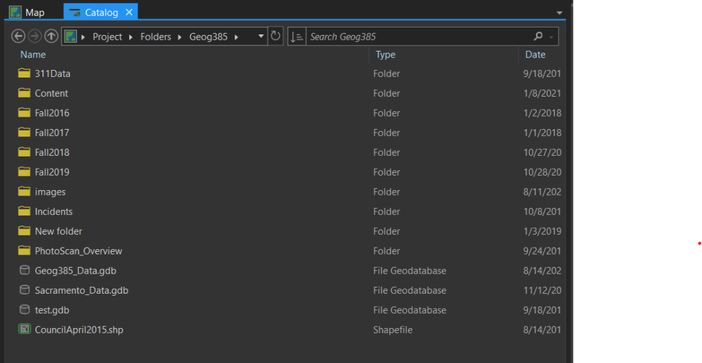 This screenshot shows different “feature class” types (points, lines, polygons) that are stored within a file geodatabase. Many GIS professionals refer to the “feature classes” as “files” within the file geodatabase. This is incorrect. Each point, line, and polygon are “feature classes” that are stored in the file geodatabase.